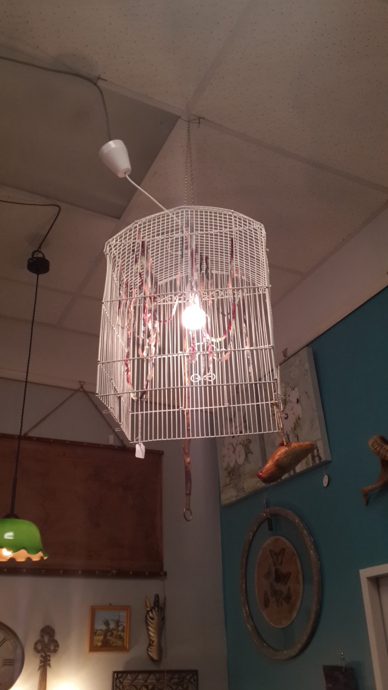 这个鸟笼是Camel在路边捡的,原来是黑色的,Camel把它漆成白色,然后在里面装了亚光灯泡,挂上几缕彩色的羽毛,鸟笼下面完全打开,再挂上一只木质的小鸟。一个在路边黑漆漆的鸟笼就变成了现在这个时尚的挂灯。