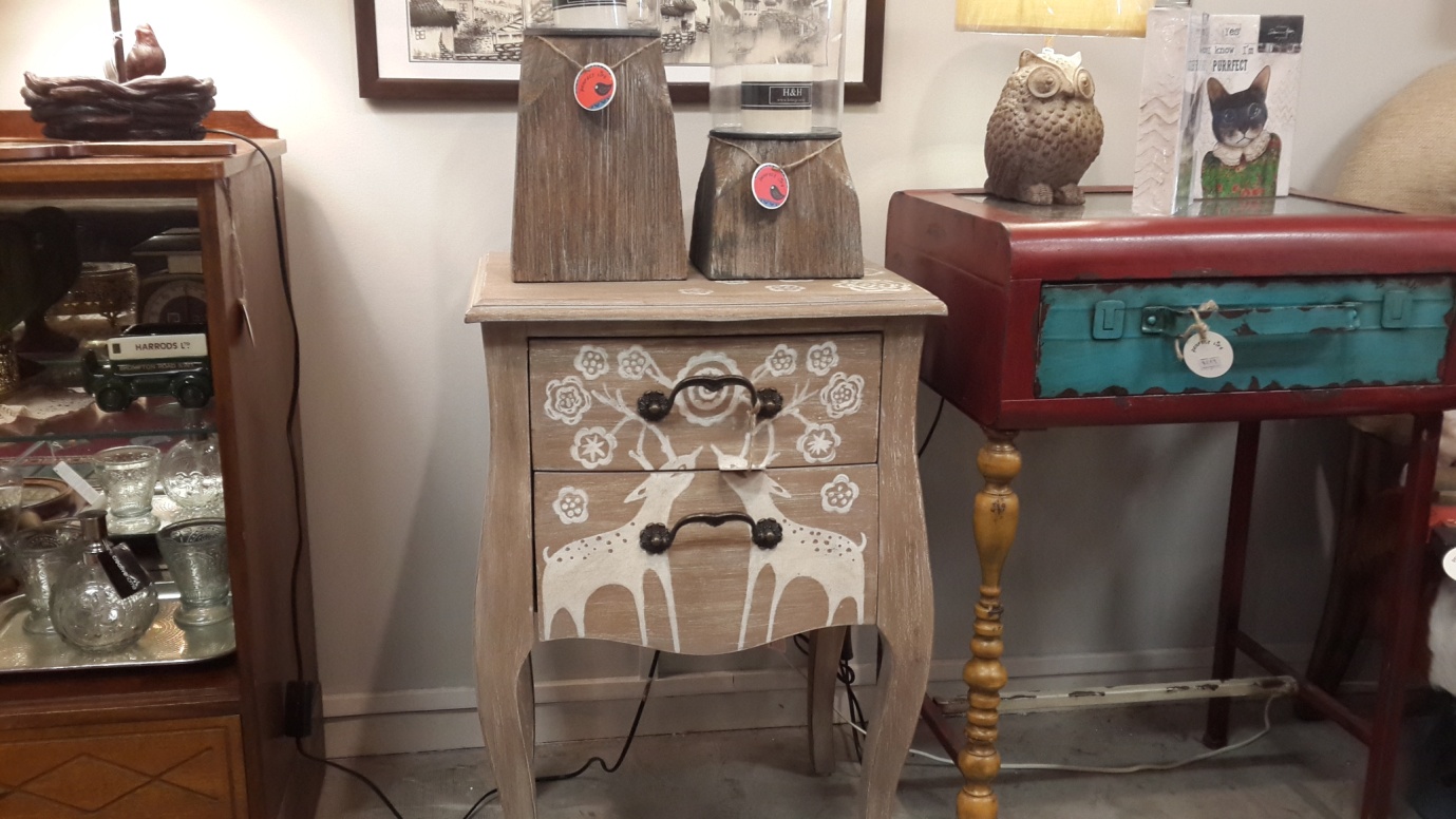 这个柜子是新西兰当地制作,出口到美国的一款家具,上面的小鹿图案是手绘的。