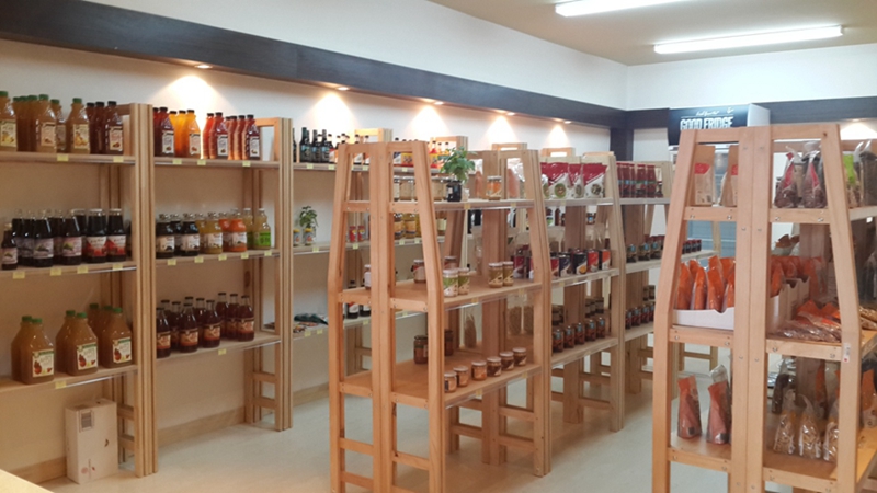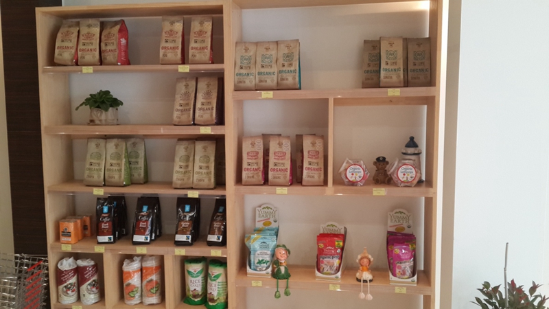 目前店里共36个货架,其中30个货架上摆放着各种有机食品:有机果汁,有机蔬菜汁,有机咖啡豆,有机饼干,以及各种有机零食等三十多种不同口味和品牌的产品,如Ceres Chantal,INCAFE等品牌;而另外6个货架上则摆放了有机保健品和有机保养品。