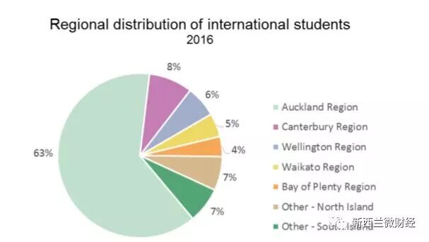 在全部这些留学生中,大部分都住在奥克兰并使奥克兰成为本地最重要的留学市场,同样是以2016年数据看,奥克兰国际留学生人数占NZ总数63%,其次是坎特伯雷和惠灵顿,但都不到两位数远远落后于奥克兰: