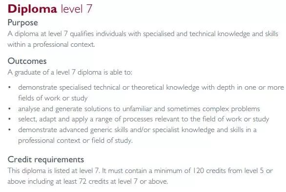 在新西兰学历架构NZQF(The New Zealand Qualifications Framwork)的目前规定下,Level 7 diplomas被视为和本科生同等学历,