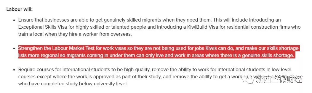 “Strengthen the Labour Market Test for work visas so they are not being used for jobs Kiwis can do, and make our skills shortage lists more regional so migrants coming in under them can only live and work in areas where there is a genuine skills shortage. ” 和国家党政策相比,工党移民政策是短缺技能突出地域特点,在工签发放中加强劳动力市场测试,通过地区短缺技能通道的移民“只能在该区域内生活和工作”。